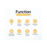 | The AMCD2100 model features a maximum output of 60W (30W x 2) and It also features multiple connectivity options such as Bluetooth, USB, CD, AUX, Optical, Coaxial, and DSP, as well as a FM radio, two microphone inputs, and a subwoofer output. Utilizing a powerful output of 30W x 2 at 1 KHz with a THD10% measurement, the CDD 2.0 Ch. Amplifier provides exceptional sound quality. |